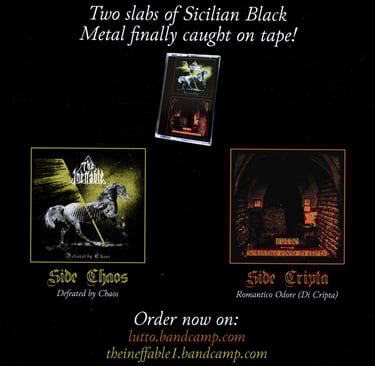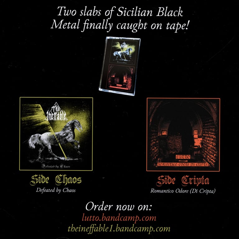 Nevertheless, The Ineffable remains an extremely important chapter in my musical journey: together with the two "Polemics and obscenity" EPs (which I finished writing around the same time, despite releasing them only in 2024), it helped me crawl my way out of a creative/identity crisis I was going through at the time (in this regard, lyrics for "Defeated by Chaos" are extremely personal, which is why I never published them), allowing me to explore unknown territories and express a more vulnerable side of myself (without irony or anti-climactic dissimulation) before returning home, in the realm of raw sonic sewage, with a renewed confidence in my own abilities. In this respect, I can add that without my brief experience as The Ineffable, I don't think I would have started the Black Katharsis project - which instead is a thorough, proper exploration of black metal's rawest, darkest, most lo-fi essence that still goes on to this day, and for which (coincidentally) the first few songs were written just shortly after the release of "Defeated by Chaos". Nothing's created and nothing's destroyed, I guess?